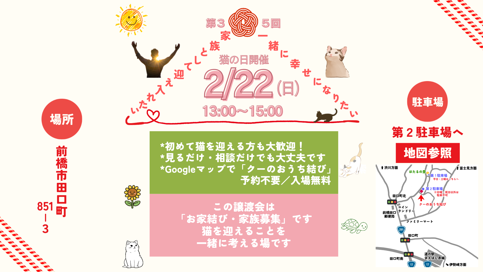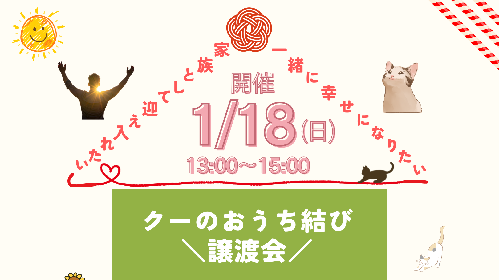 CATEGORY 活動報告26年 26/2/22(日)第35回クーのおうち結び\譲渡会/を開催します! 2026.02.03 活動報告26年 mugirikuto32 クーのおうち結び 26/1/18(日)第34回クーのおうち結び\譲渡会/を開催します! 2026.01.12 活動報告26年 mugirikuto32 クーのおうち結び