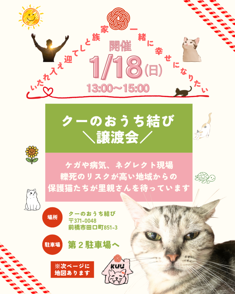 2026.01.12 2026.02.11 活動報告26年 26/1/18(日)第34回クーのおうち結び\譲渡会/を開催します! mugirikuto32 プロフィール フカシロリクトクーさんのおうち探し 代表InstagramYouTubeLINEContact2021年3月に縁あって群馬県前橋市へ移住しました。 物件の周りに猫が20匹以上も大量繁殖しており、目の前で亡くなっていく命を目の当たりにして、この子たちと向き合うことにしました。